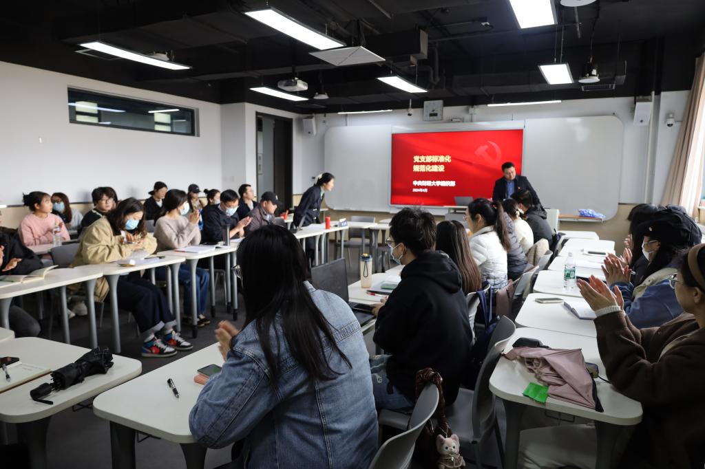 2024年4月10日下午在10号学院楼317教室,组织部姚逍副部长为我院党务工作者进行党支部标准化规范化建设专题培训,培训由学院党委书记陈文娟主持,党委副书记徐芳,全院党支部书记及支委参加了会议。